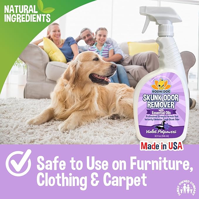 • Pleasant Fresh Violet Potpourri Scent: Our deskunk spray starts eliminating scent on contact leaving behind a delightful, pleasant fresh violet potpourri scent. The convenient spray bottle is a must have for a pet owner living in a neighborhood or near woods and wooded areas where you never know when animals will turn up and skunk your poor pet! Be ready this skunk season with our natural great smelling de-skunk spay.