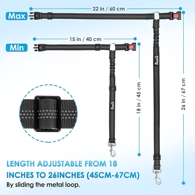 • 【Adjustable Length】- With buckle on the straps and the elastic bungee inside, this seat belt can be adjusted from 20 inches to 27 inches and can be stretched to 32 inches for the maximum length. The circle can be adjusted from 16 inches to 24 inches. Good adjustable length so the dogs can get themselves comfy without restricting themselves.