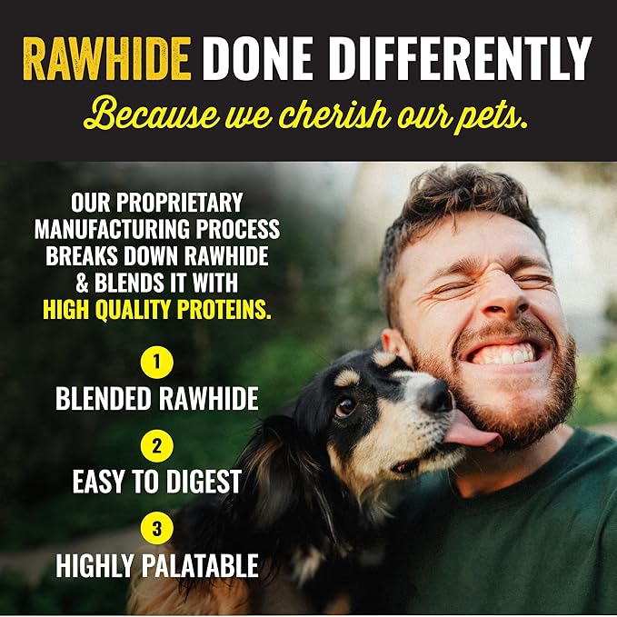 • Blended Rawhide – Our proprietary manufacturing process breaks down rawhide and blends it with protein.