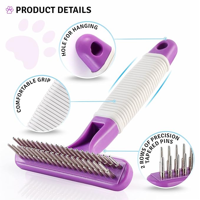 POODLIE Poodle Pet Dog Grooming Rake| Dematting Tool with Stainless Steel Shedding Comb for Pets | 2 Rows of Pins Gently Remove Loose or Tangled Hair from Undercoat | Purple Handle