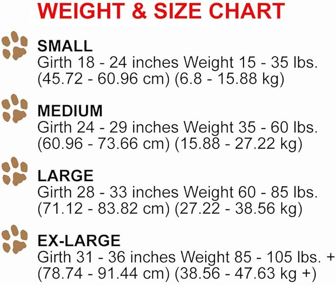 • FOUR SIZES, adjustable at the Neck and Girth. For a proper fit, it is IMPERATIVE that you measure your dog per the Measuring Instructions provided, then select proper size from the Size Chart. Sizes - SMALL: Girth 18 - 24 inches, Weight 15 - 35 lbs. MEDIUM: Girth 24 - 29 inches, Weight 35 - 55 lbs. LARGE: Girth 28 - 33 inches, Weight 55 - 85 lbs. EXTRA LARGE: Girth 31 - 36 inches. Weight 85 - 105 lbs.