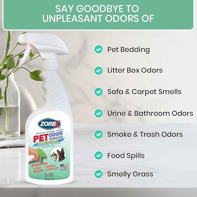 - REMOVES PET ODORS PERMANENTLY: Long gone are the days when pets were not allowed inside the house. Now, they cuddle with us on a sofa, snuggle with us in our beds and even go to dinner with us at our favorite restaurant. However, once they start smelling stench, it isn't easy to enjoy their company. So, what to do? Try ZORBX odor remover spray to keep your pet smelling fresh and clean.