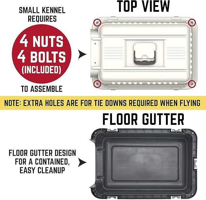 • Sturdy durable plastic construction very easy to assemble. Tie down holes for bungees required by airlines
