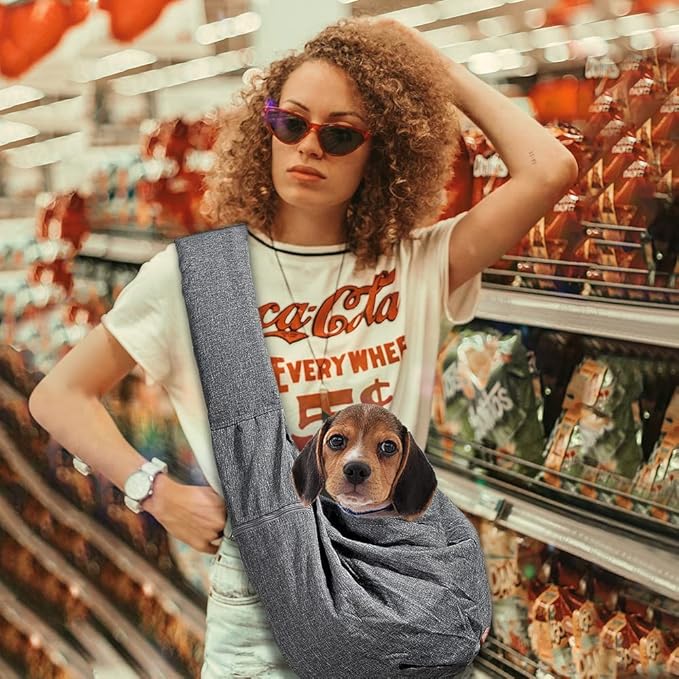 Dog Cat Sling Carrier Adjustable Padded Shoulder Strap with Mesh Pocket for Outdoor Travel (Grey, L - 8 to 15 lbs)