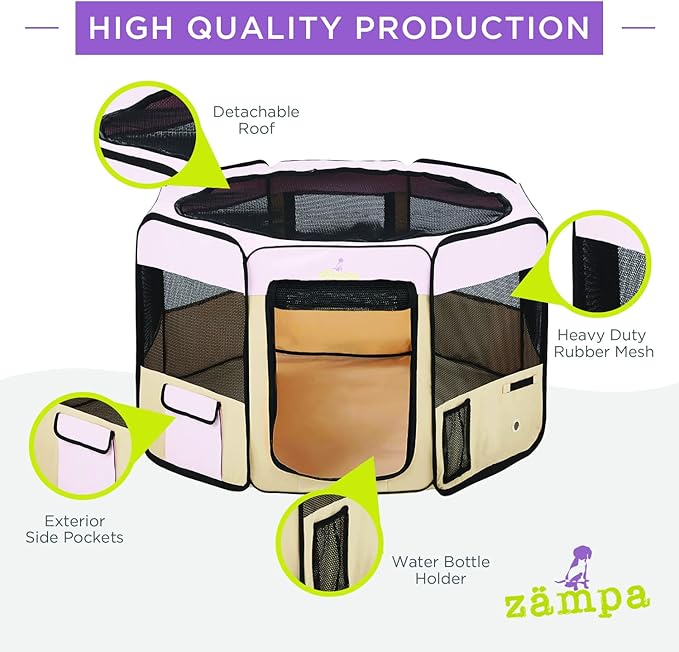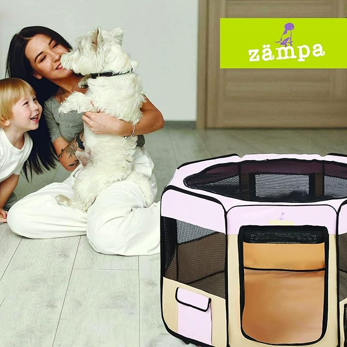 • What To Expect From Zampa: Playpen, mesh top to zip on when needed, 4 metal spikes for outdoor safety, carrying case, and a commitment from our customer service team. Please don't hesitate to contact our customer service and BARK, we will make it right.