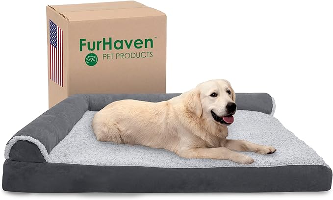 Furhaven Memory Foam Dog Bed for Large Dogs w/ Removable Bolsters & Washable Cover, For Dogs Up to 125 lbs - Two-Tone Plush Faux Fur & Suede L Shaped Chaise - Stone Gray, Jumbo Plus/XXL
