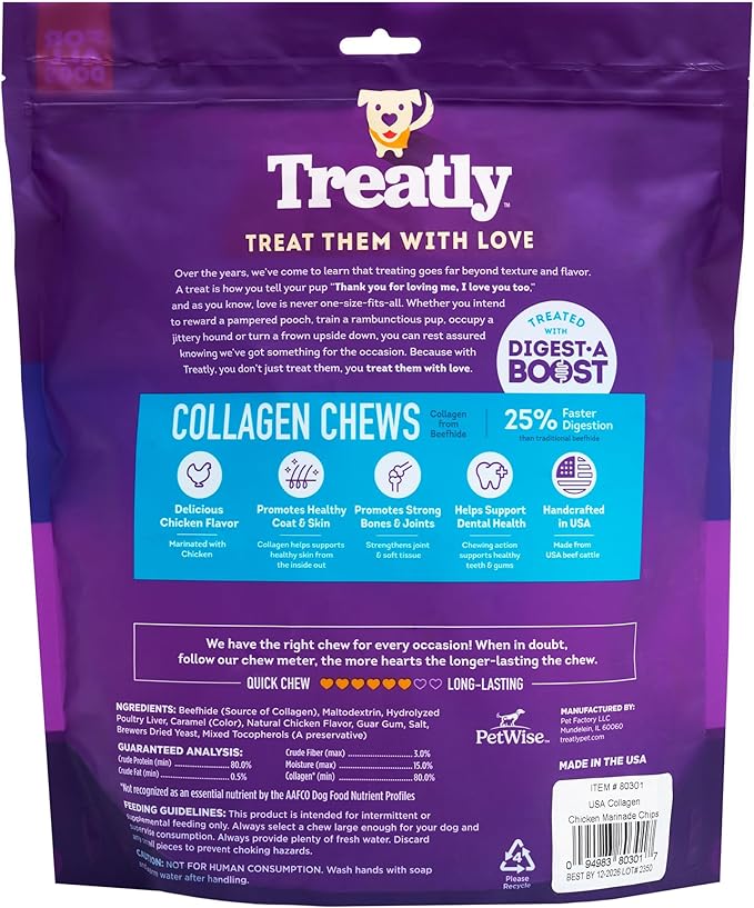 • ABOUT US: Treatly is the newest member of the PetWise, Inc. family of award-winning, industry-leading brands and manufacturer of USA-sourced beefhide bones and chews; our beefhide products come in a variety of shapes and sizes for every dog, including bones, rolls, and chips in various flavors