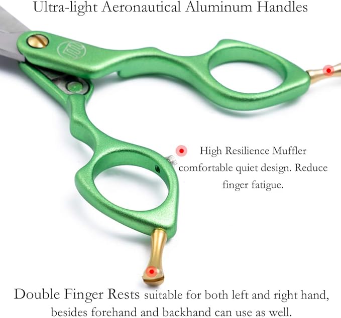 • AERONAUTICAL ALUMINUM HANDLE - The pet grooming curved scissor was hand-made of Ultra-light Aeronautical Aluminum Handles with ergonomic shape for comfortable and dynamic grip, extremely comfortable and help to minimize the strain and discomfort. A useful adjustable tension screw makes it easy to adjust the pet grooming scissor to match the needs and ensure a smooth scissoring action time after time