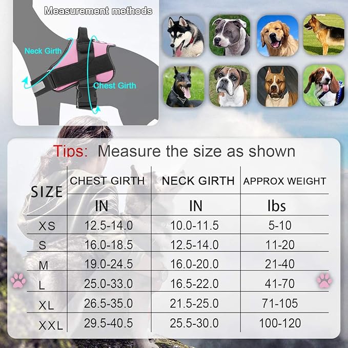 • LARGE DOG HARNESS: ★Approx Weight: 41-70 lbs. Neck Girth: 16.5"-22", Chest Girth: 25"-33"★. It perfect for large dogs, like Labrador, Basset hound, Catahoula, Brittany spaniel, Staffordshire terrier, Husky, Golden doodle, Boxer, GSD, English setter, Dalmatian, Rottweiler, Springer spaniel, German Shepherd, Aussies, Doberman, Alaskan malamute, etc.