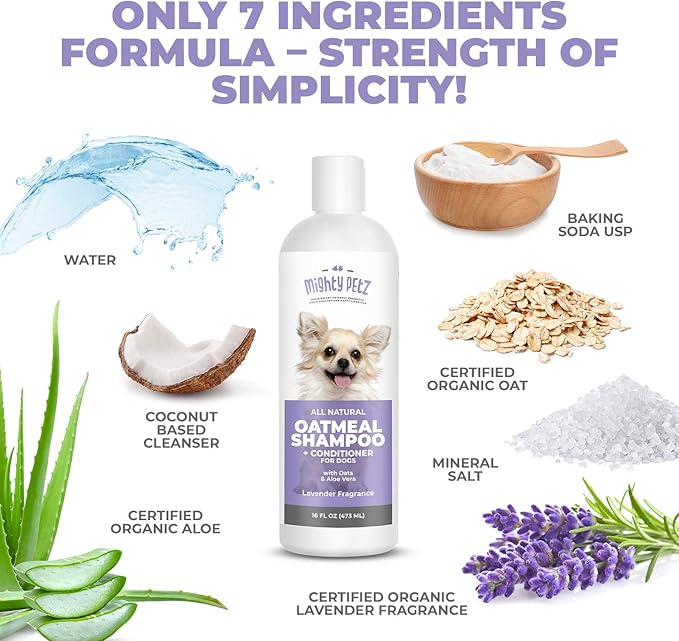 • Soothing Oatmeal, Aloe Vera, and Coconut: Gentle dog shampoo with natural ingredients to moisturize dry, itchy, and sensitive skin; helps with seasonal allergies