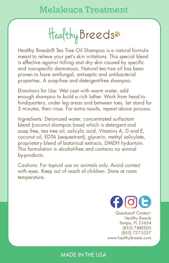• Healthy Breeds Tea Tree Oil Shampoo is a free of soaps and detergents -- A natural formula meant to relieve your pet’s skin irritations