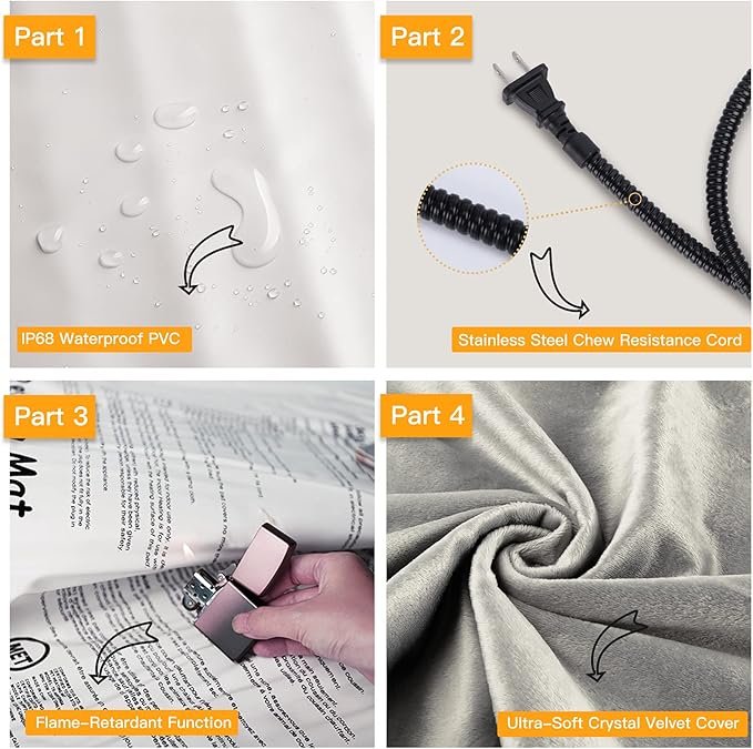 - ❤【Safety and Secure Structure】7-layer protective structure with UL-certified heating wire protect pets from burns. Soft PVC envelope with waterproof and flame-retardant function. Built-in intelligent temperature sensor in the heating pad to prevent overheating to protect pets. Don’t let your pets lay on the pet heating pad without a plush cover.