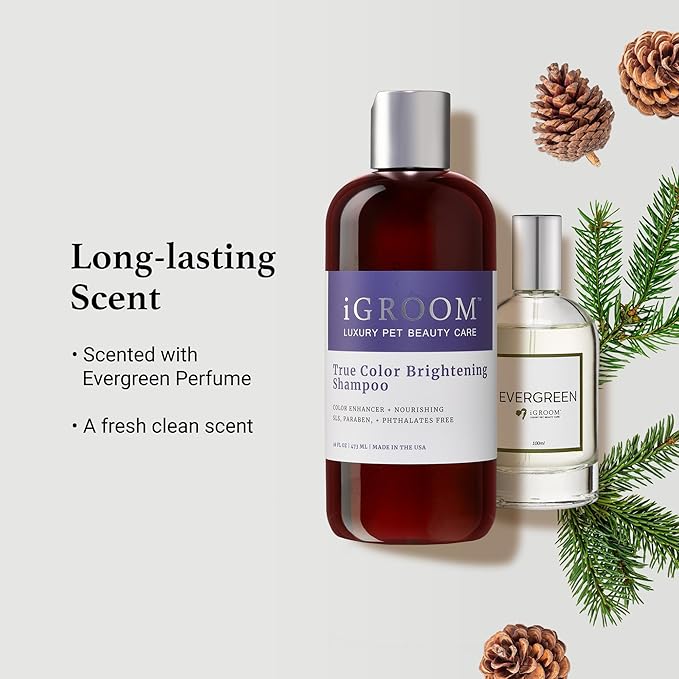 • COLOR ENHANCING DOG SHAMPOO – safe for all color coats. iGroom’s True Color Brightening Shampoo neutralizes unwanted tones in white coats and adds brilliance and depth of color to dark coats. Expect a glossy, radiant coat full of luster. With the fresh clean scent of iGroom Evergreen perfume.