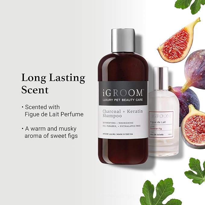 • DETOXIFYING DOG SHAMPOO – detoxifies, deodorizes, and deep cleans. For all coat types but works especially well on curly-coated breeds, including Doodles. Keeps the coat fluffy, soft and reduces frizz. Removes product residue and buildup, deeply cleanses and volumizes – ideal for show dogs. Scented with iGroom Figue de Lait perfume. For maximum results follow with iGroom Charcoal + Keratin Conditioner.