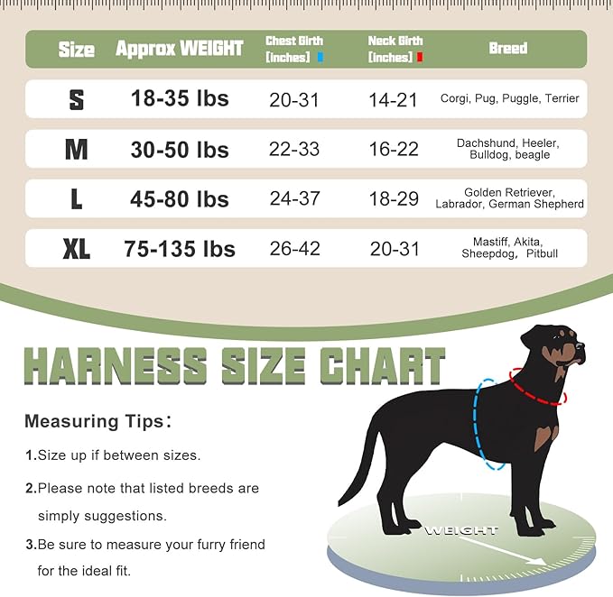 • 【Guaranteed Satisfaction 】 Be sure to check our sizing chart for the perfect fit. Against any quality issues or questions about our dog vest harness, don't hesitate to reach out to us. We are here to assist you and ensure your complete satisfaction.