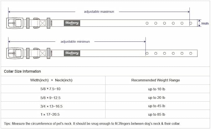 • Neck 17"-20.5", Width 1"; The collar does not stretch itself, please make sure leave ONLY 2 fingers between collar and dog neck. A properly fitting collar and harness won't leave any room for your dog to chew