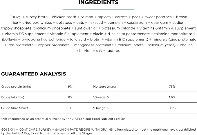 Go! Solutions Skin + Coat Care, Wet Dog Food, Turkey and Salmon Pâté with Grains Sensitive Skin, 12.5 oz