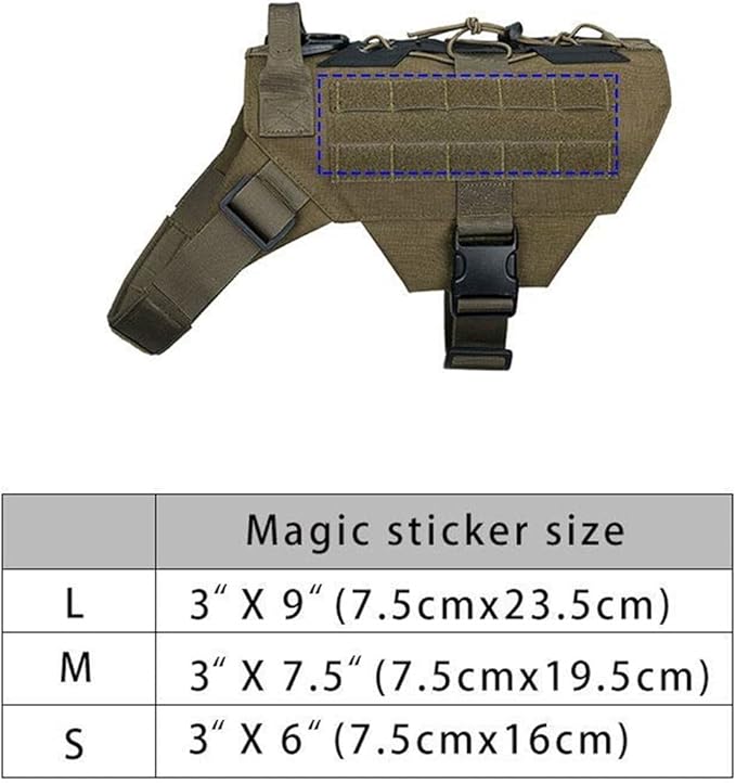 • Top of the military dog harness has a buckle, can be attached a dog leash to keep your dog next to you. There is an magic sticker ID panel & Molle system on both sides of this tactical harness dogs that can be placed for patches or and you molle pouch.