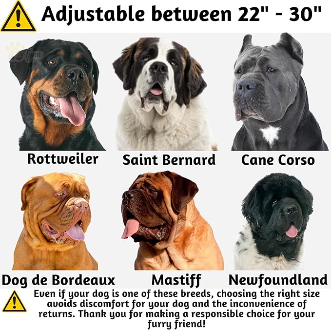 • BEST CHOICE DOG COLLAR FOR EXTRA-LARGE DOGS with a neck size between 22 to 30 inches; width is 1,5 inches; and a total length of the collar is 32 inches. Examples of extra-large dog breeds are Great Danes(150-200lb), Bernese mountain dogs(85-100lb), Rottweilers, Cane Corso, Mastiffs, Newfoundlands, and Saint Bernards. To ensure you'll receive the best-fitted size for your dog please measure his neck before choosing the size and then check the sizing table.