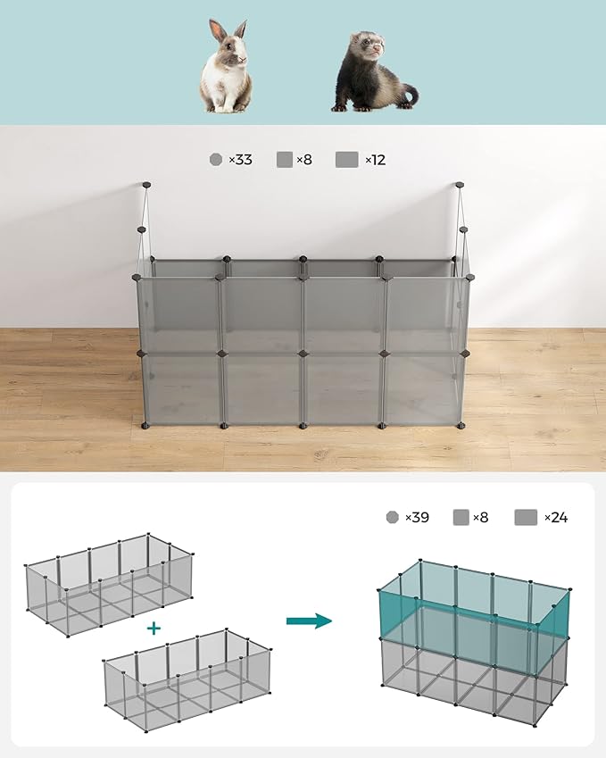 • [Customizable and Expandable] Arrange this flexible pen in an L-shape to fit your corner space or stack them into a 2-story pet house within the limit of the included parts. Please see the recommended assembly methods below for further details