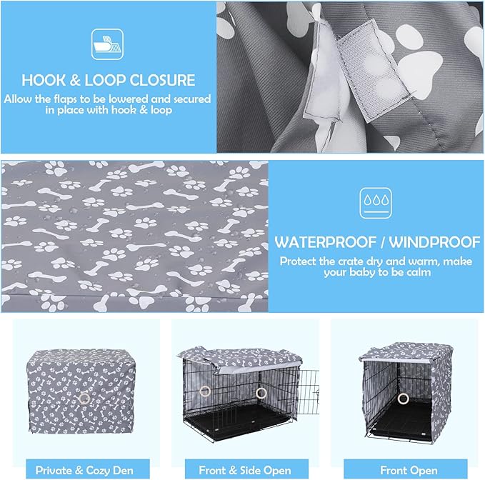 • 2: Waterproof fabric will keep your crate dry. Open Panel simply folds back to allow your crate door to open & close. Made for indoor and outdoor use.