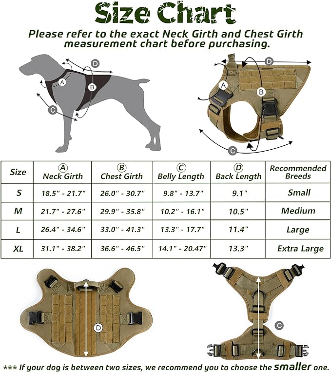 - Extra Large Dog Molle Vest: Neck Girth: 31.1”-38.2”(79-97cm), Chest Girth: 36.6”-46.5”(93-118.1cm), Belly Length: 14.1” - 20.47”(35.8-52cm), Back Length: 13.3”(33.8cm). Ideal for Large Breeds such as German Shepherds, Belgian Malinois, Golden Retrievers, Huskie, Labrador, Akita, etc. A professional working dog vest for service, police, or military dogs, but also suitable for hunting and all outdoor companion dogs