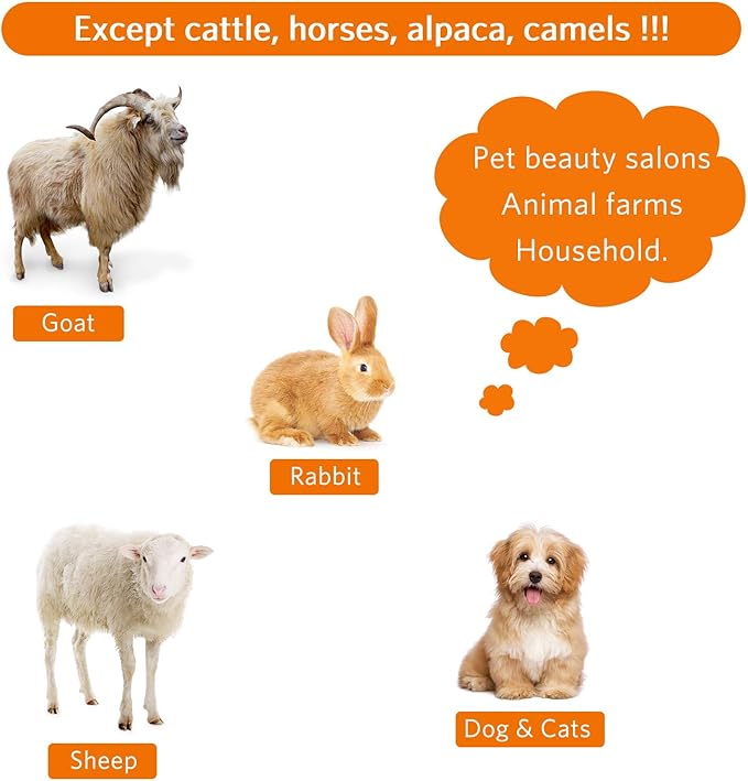 • Scope of application: this pet electric clipper is mainly suitable for animals such as goats, sheep, long-haired dogs, cats and rabbits (except cattle, horses, alpaca, camels), and can be applied in beauty salons for pet, farms and household