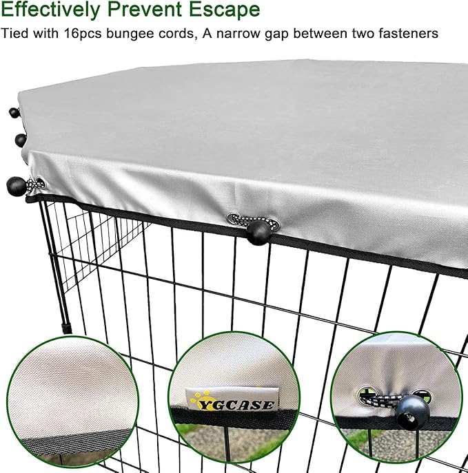 • PREVENT ESCAPE- The protective net is tightly tied with 16pcs bungee cords, so there is just a narrow gap between two fasteners. It effectively prevents the puppy from jumping up and out of the pen