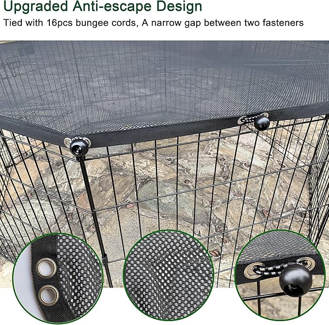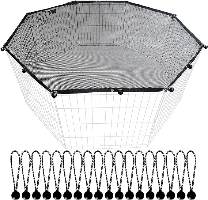 • PREVENT ESCAPE- The protective net is tightly tied with 16pcs bungee cords, so there is just a narrow gap between two fasteners. It effectively prevents the puppy from jumping up and out of the pen