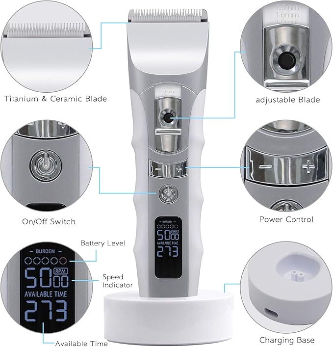 • 🎁[Removable and replaceable blades] Movable ceramic blades fixed titanium alloy blades slide effortlessly through the thick coating, sharp and easy to clean. Replaceable narrow blades for hair around paws, hips, face, ears and beards. The LCD screen displays power and speed for ease of use.
