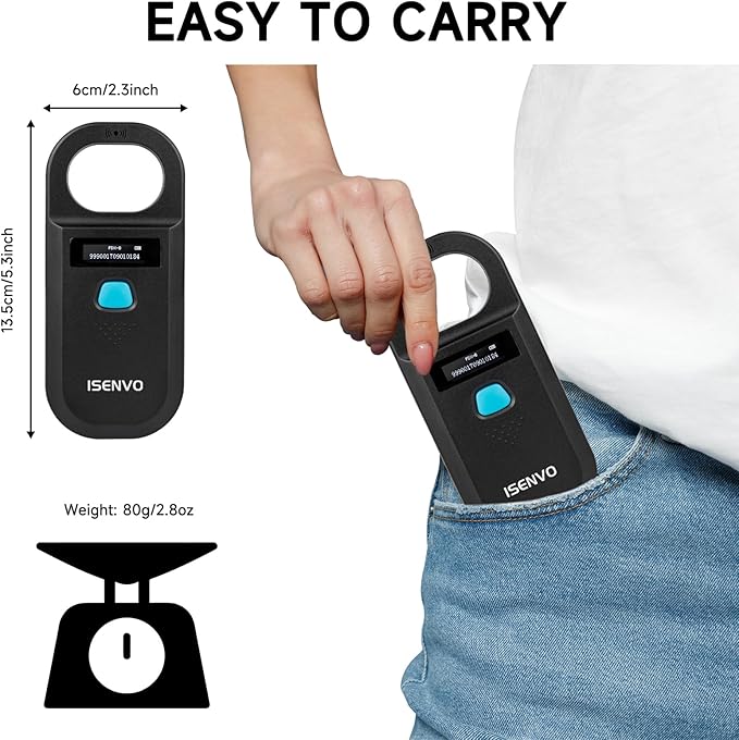 • 【Pet Microchip Scanner Helps Animals go Home Again】Pets are your little friends who accompany you every day, so you don't want to lose your pets and accidents. The pet scanner can help you accurately scan the pet chip code, and register the website https://isenvo.com/ to know the detailed location after it is lost;