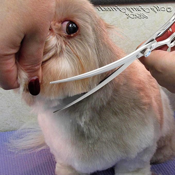 - MULTIFUNCTIONAL - 8 inch scissors with 4.2 inch cutting blades, the pet scissors are ideal for pet hospital, pet salon, and family to use on dogs, cats and so on. The curved blades are suitable to grooming the sensitive areas such as face, ears, paws, nose, limbs and so on. You can become a professional pet beautician at home, saving time and money. The curved scissor for dog grooming is also definitely the perfect gift for relatives and friends, especially for dog or cat lovers.