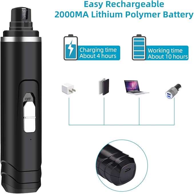 • 【Cordless & Rechargeable】 The compact cordless cat nail grinder have a built-in 2000mAh battery that only need be full charged 4h to support 10 h working time,saving time and convenient to charge via laptop, or power bank ect.. It’s essential to find an effective and comfortable dog nail trimmer that works well for your best furry friends!