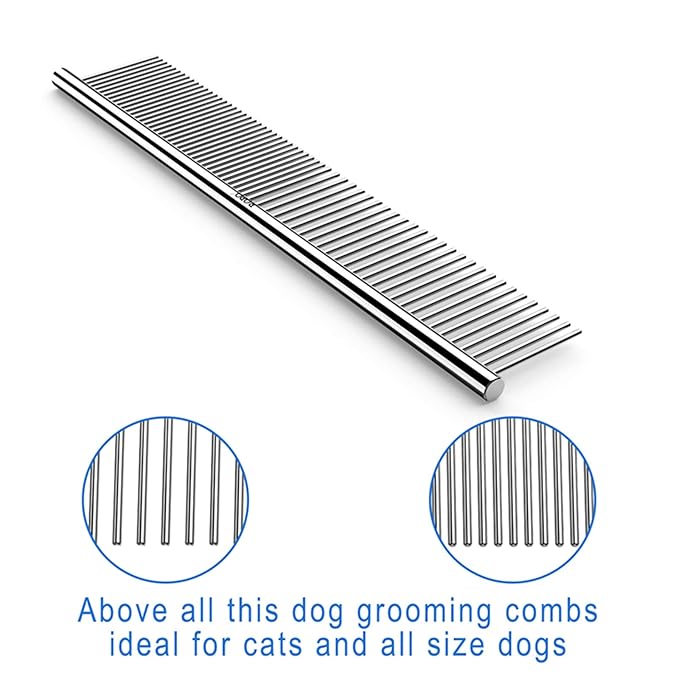 • DETAILED DESIGN: These dog combs have two different densities of wire teeth. Wide teeth can be used for combing knotted fur, while close teeth are ideal for brushing soft hair around the eyes, ears and fine hair on the legs. Please comb the fur lightly.