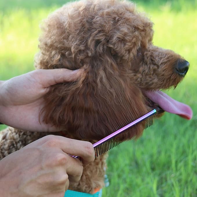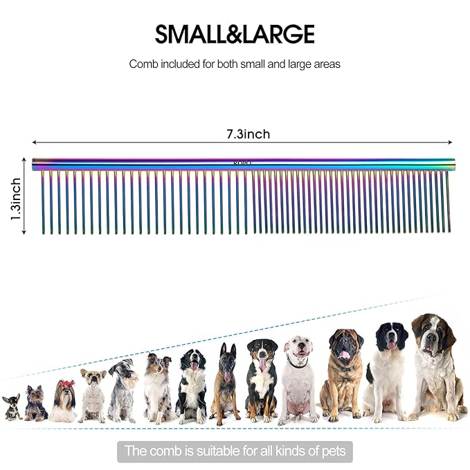 • PREMIUM MATERIAL: The dog grooming comb is made of premium stainless steel, this steel comb teeth is smooth and durable, corrosion resistant and will not fade, also benefit for avoiding static electricity when used.