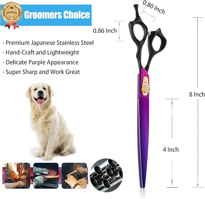 PURPLEBIRD 8 Inch Straight Dog Grooming Scissors Professional Pet Cutting Shears Safety Noiseless Blunt Tip Trimming Shearing for Dogs Cats Japanese Stainless Steel Purple