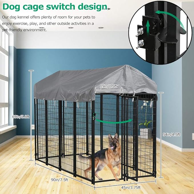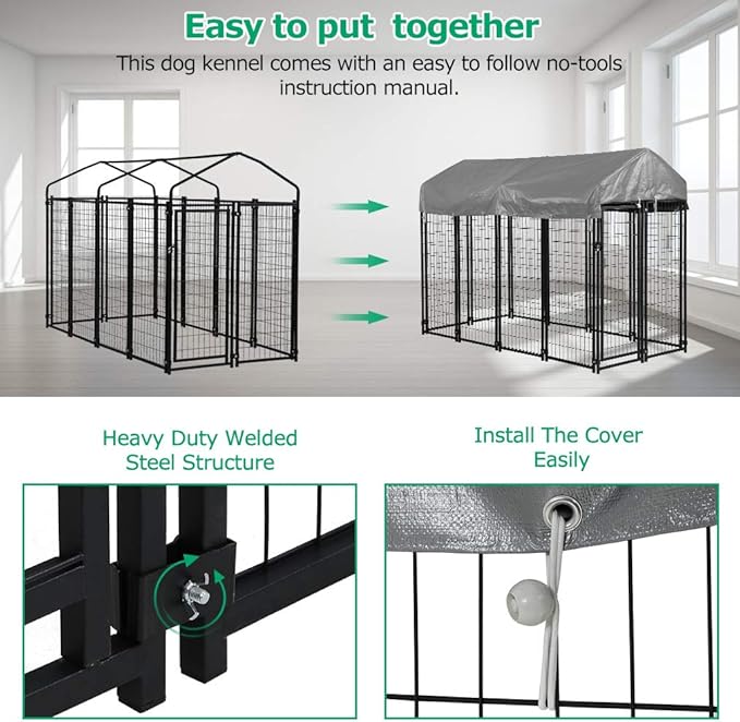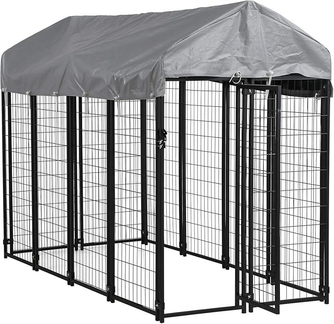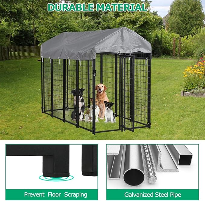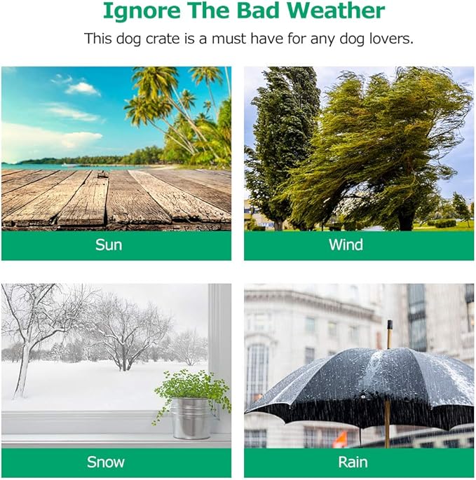 • 【WATERPROOF COVER INCLUDED】The waterproof cover of heavy duty dog crate and steel roof frame fit the outdoor dog cage perfectly and the enclosed ends provide your pet with full protection from sun, rain, snow and debris. Added UV protection prevents ripping, cracking, fading or peeling giving you years of worry-free use. The roof pitch of pet crate allows for water, debris and light snow to run off instead of accumulating on the roof. dog crate dog cage pet crate.