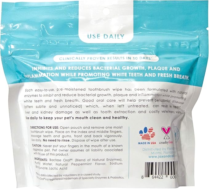 • Toothbrush Wipes: PROTECT YOUR PET – Jax & Cali Toothbrush Wipes are the solution to your puppy and kitten dental needs! Each antimicrobial, antibacterial, pre-moistened wipe reduces plaque and inflammation while promoting white teeth and fresh breath.