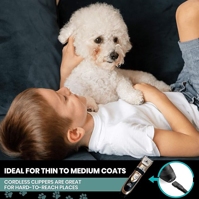 • Everything You Need in One Kit - If you're looking for the complete pet grooming kit for your dog, cat or other furry friend, look no further! Premium dog grooming clippers to help you professionally groom your pets coat and nails - Including clippers, multiple guards, nail trimmers, scissors, and more