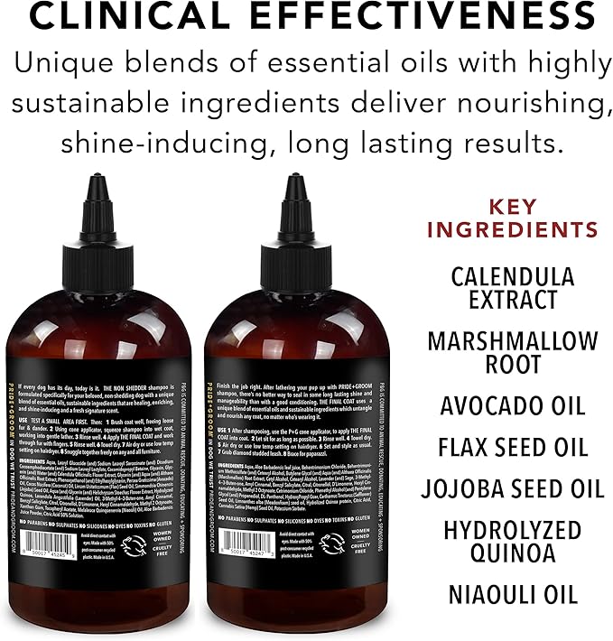 • PRIDE+GROOM BOX SET: Beautiful gift box that includes THE NON SHEDDER shampoo and THE FINAL COAT conditioner packed with essential oils & smoothing ingredients for a non shedder’s hair coat.