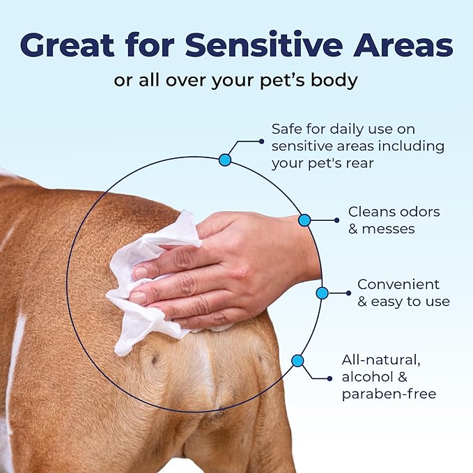 • SUPPORTS HEALTHY ANAL GLANDS & HYGIENE - Convenient soft & durable dog wipe for daily hygiene can be used all over body, on paws coat face ears & anal area. Great for dogs and cats of all ages.