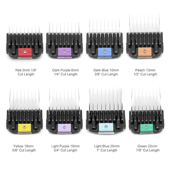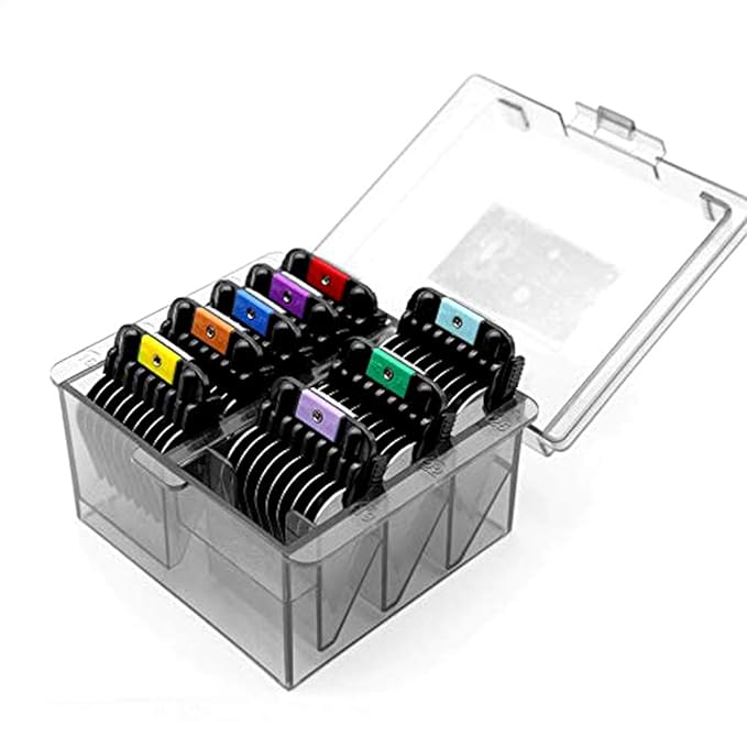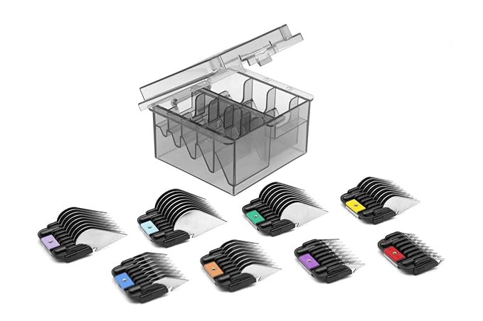 • What You Get: Set of 8 stainless steel guide combs for pet grooming and a storage box .