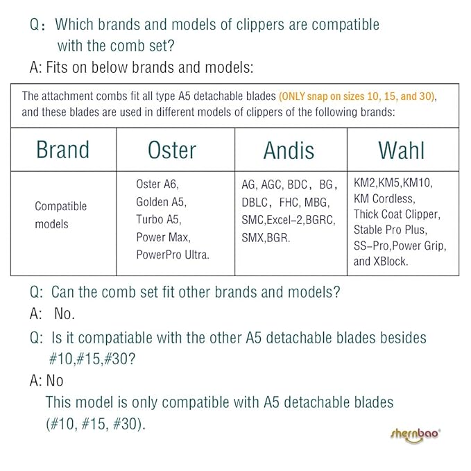 • The attachment combs fit all type A5 detachable blades (sizes 10, 15, and 30) ,These attachment combs are designed to fit over standard A5 detachable blades and come in sizes that address the most common grooming needs. also compatible with most Oster ,Wahl and Andis detachable-style clippers.