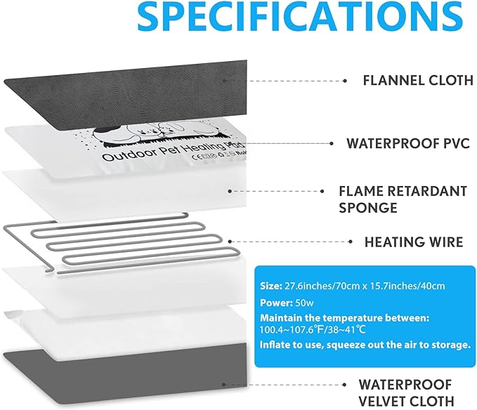 • 🐾ENERGY SAVING & SAFE 🐾 This outdoor heating pad is only 50w, thus it is more energy-savings. Anti-bite power cord design, the extra-long cord extends 5.91 feet with a 4.92 feet steel-encased chew guard. Furthermore, made of fireproof material, so it is really safe for you and your pets.