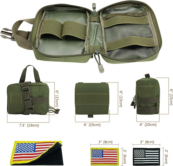 • MOLLE SYSTEM --- Each side features 2 molle straps + hook and loop strips panel + 3 nylon loops for attaching molle pouches,ID panels,morale patches,accessories,such as dog folded bowl,poop bag dispenser,etc. The whole package comes with 1 tactical vest harness + 1 waist pouch + 1 tools pouch + 1 EMT bag(with no emergency supplies in) + 2 US flag patches. A GREAT SAVING for you