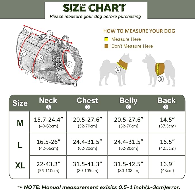 • ADJUSTABLE SIZE --- Medium: chest:20.5-27.6",back:14.5"; Large:chest:24.4-31.5", back:16.5",professional training hiking walking for medium large dogs in Training,Police,Military,Adventure Hiking and all outdoor companions,e.g.German Shepherd,Doberman,Belgian Malinois,Golden Retriever,Huskie,Labrador,Akita,etc. MEASURE your dog and refer to our SIZE CHART before order to make sure PET ARTIST Harness will fit well