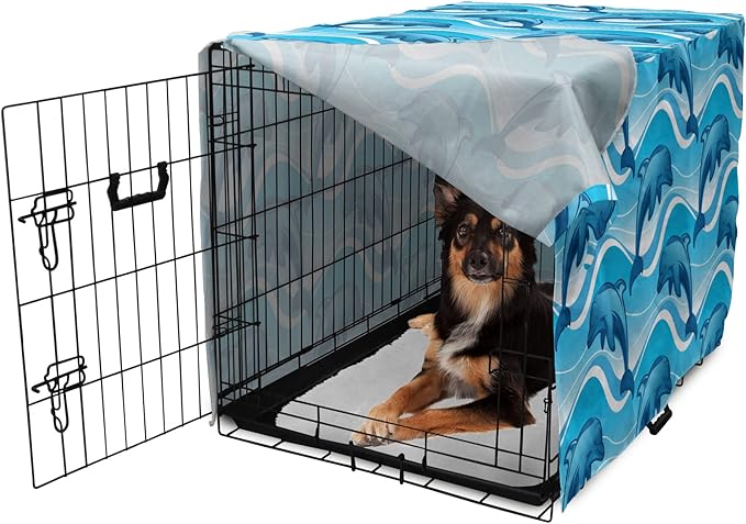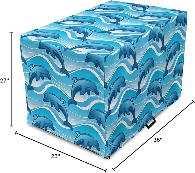 Lunarable Dolphin Dog Crate Cover, Dolphin Illustration Jumping Waves with Large Mammal Friendly Ocean Animal, Easy to Use Pet Kennel Cover for Medium Large Dogs, 36 Inch, Azure Blue White