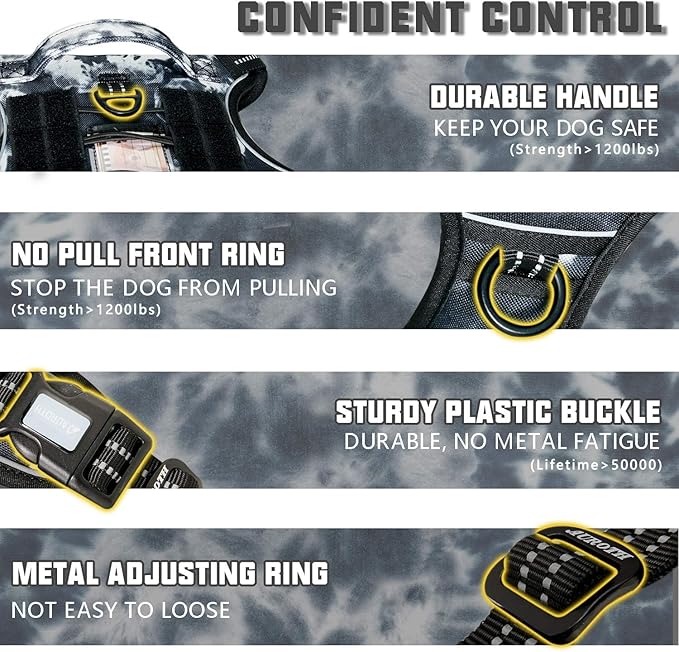 • 【Ultimate Control & SECURITY - Unleash the Power.】 Our no pull dog harness ensures maximum control for your dog with two metal leash attachment points. The front clip provides no-pull control and is great for training, while the back clip is perfect for casual walks or jogging. Walk your dog with confidence and security.
