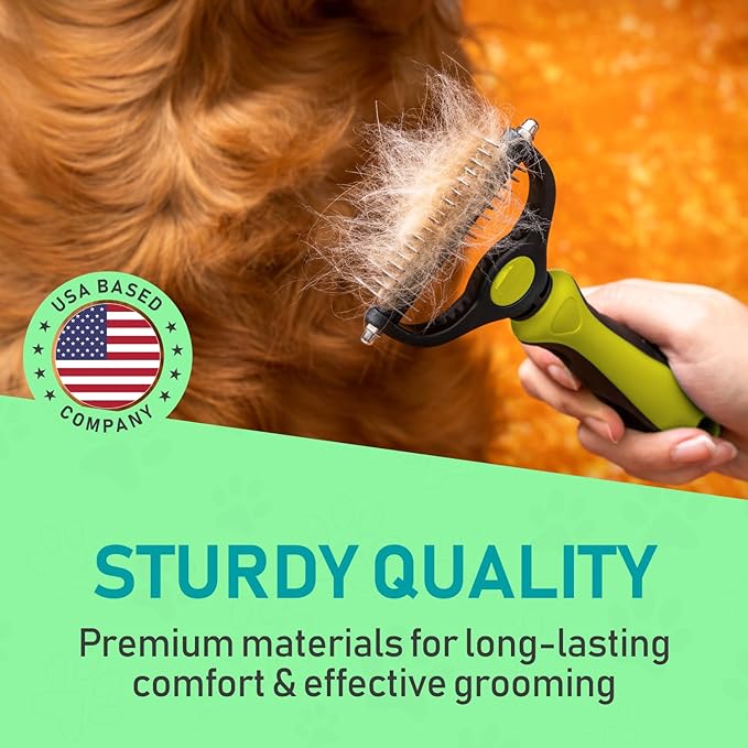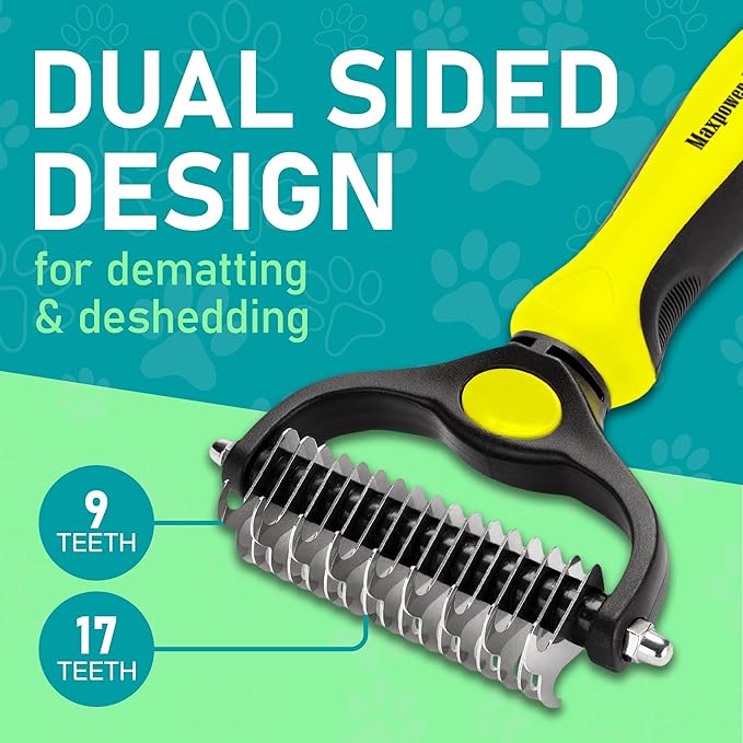 • DUAL-SIDED DESIGN: Our grooming brush is perfect for dematting and deshedding your pet's coat! With a dual-sided design, use the 9-teeth side to tackle stubborn mats and tangles and the 17-teeth deshedding tool side to thin out your pet's fur. Gently desheds and removes loose hair and eliminates tangles, knots, dander, and trapped dirt.
