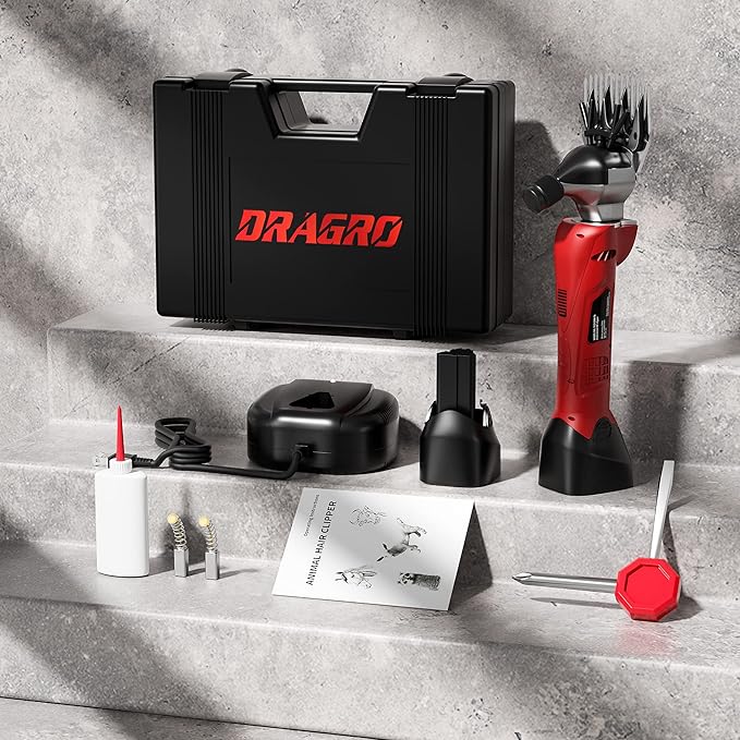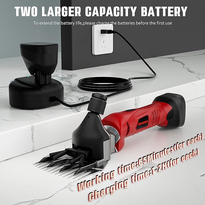 • 【Cordless Charge Shears】Comes with two 4000 mAh rechargeable batteries.Run time approximately 1 hours battery. No trailing cablesThis electric sheep shears allows you to efficiently cut your pet's hair, even if your pet is moving.An average of 8-10 sheep can be trimmed in an hour, suitable for families or pastures.